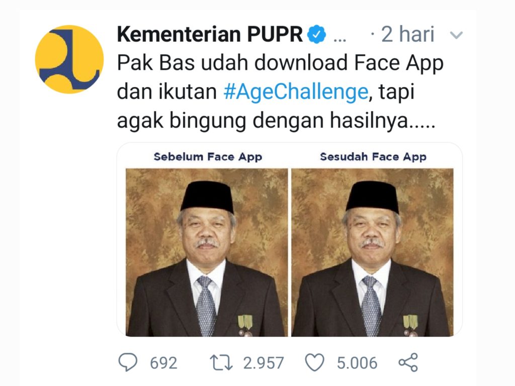 Dari sekian banyak figur publik dan artis, ternyata Basuki Hadimuljono juga tidak ingin ketinggalan. Lewat akun Twitter @KemenPU, Basuki juga terlihat mengikuti FaceApp Challenge. Dia memposting gambar before-after dengan caption, “Pak Bas udah download Face App dan ikutan #AgeChallenge, tapi agak bingung dengan hasilnya…..,”